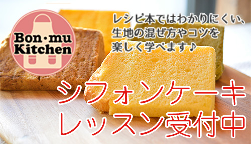 | 令和元年5月25日(土) | バナナシフォン 10:30~ シフォンケーキの混ぜ方を勉強します。 参加費6,000円(税別) |